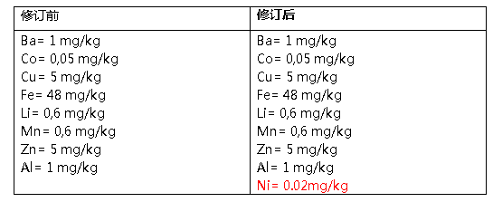 修订法规新增元素镍至附录II-限制物质中,其迁移限值为0.02mg/kg食物模拟液。修订后附录II中限制重金属如下: